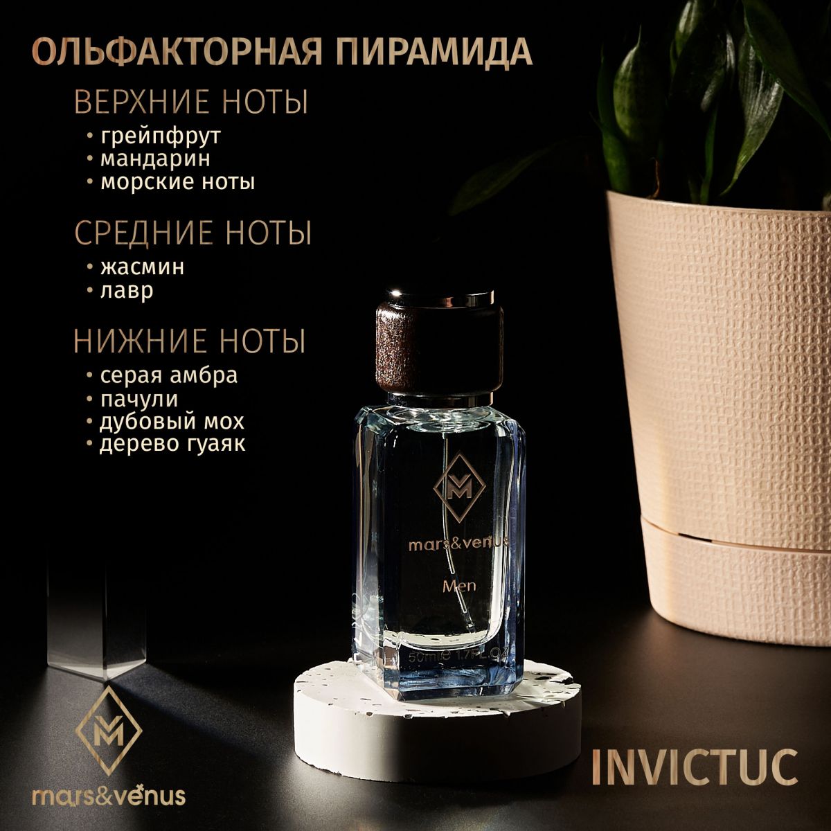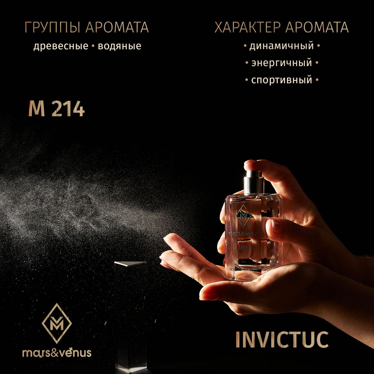 Сильный, страстный, мужественный спортивный аромат Mars-Venus M 214 Invictuc, который влечет за собой оставляя неповторимый, притягивающий след.