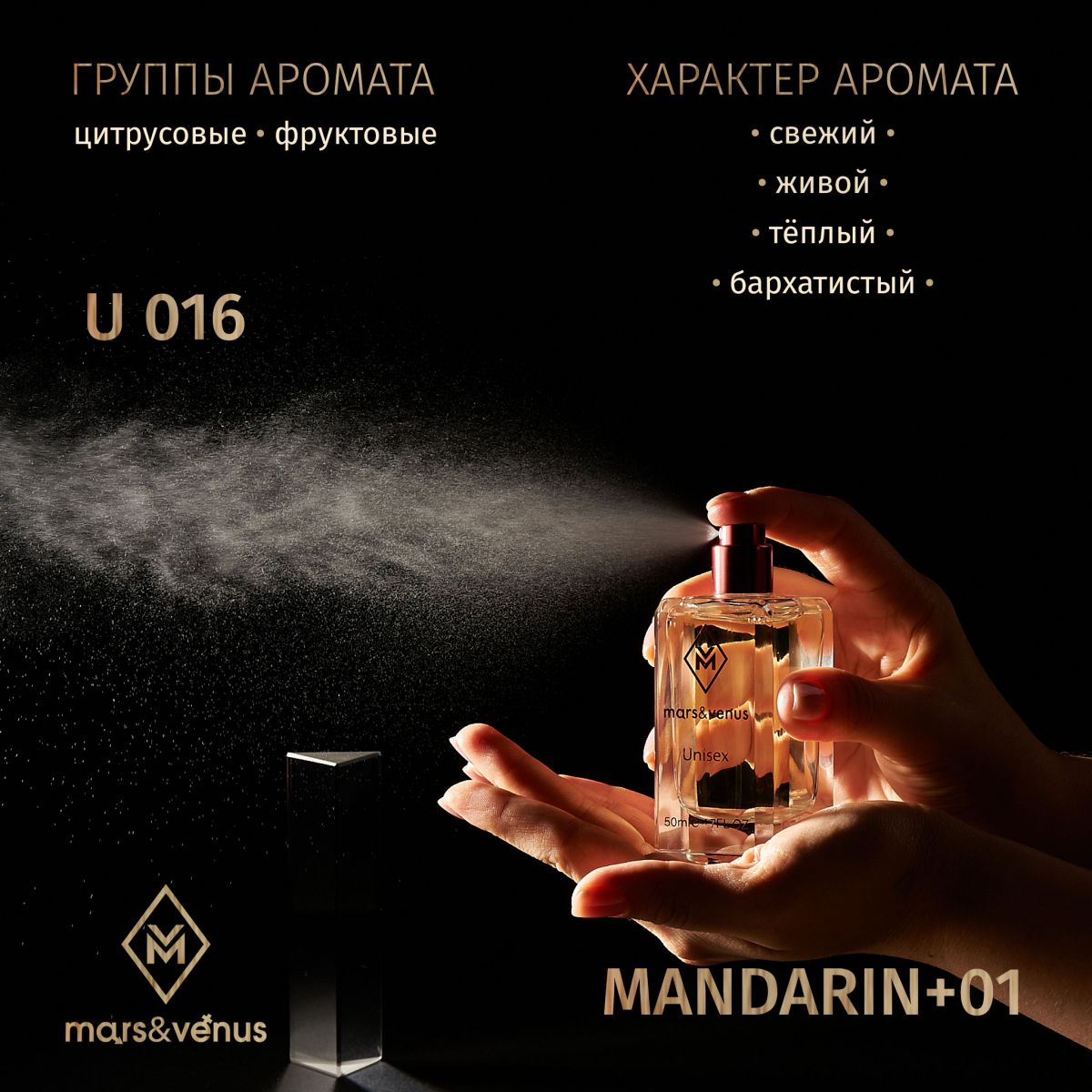 Гармоничная, необыкновенно свеже-цитрусовая и бархатисто-древесная композиция парфюмерной воды Mars-Venus U 016 Mandarin+01 индивидуально раскрывается на каждом человеке, играя своим особым звучанием.